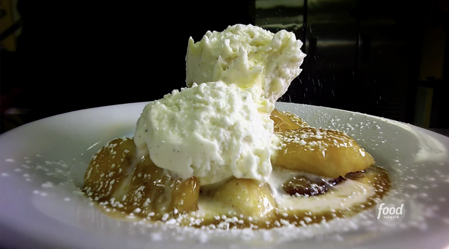 dessert; french toast served banana foster-style & topped w/ 2 scoops of homemade vanilla bean & ginger ice cream; looks good